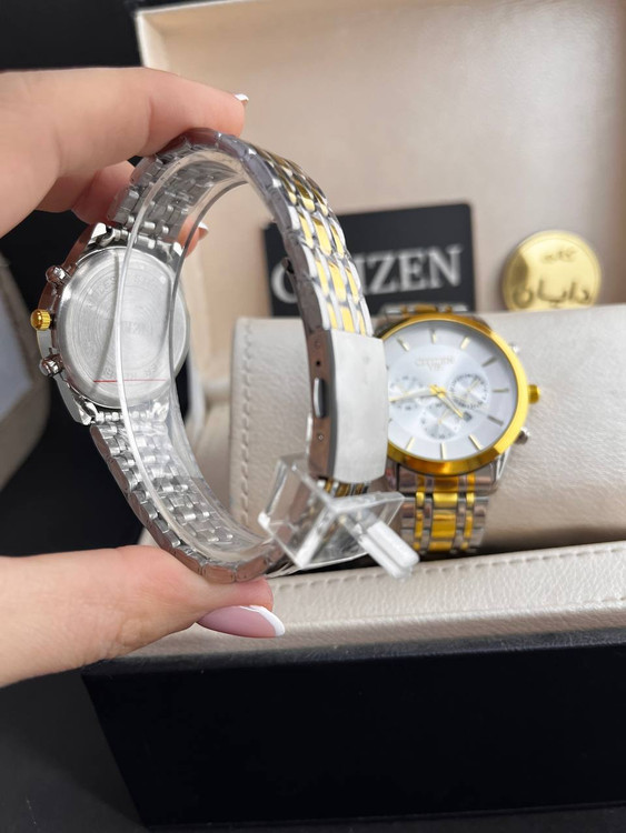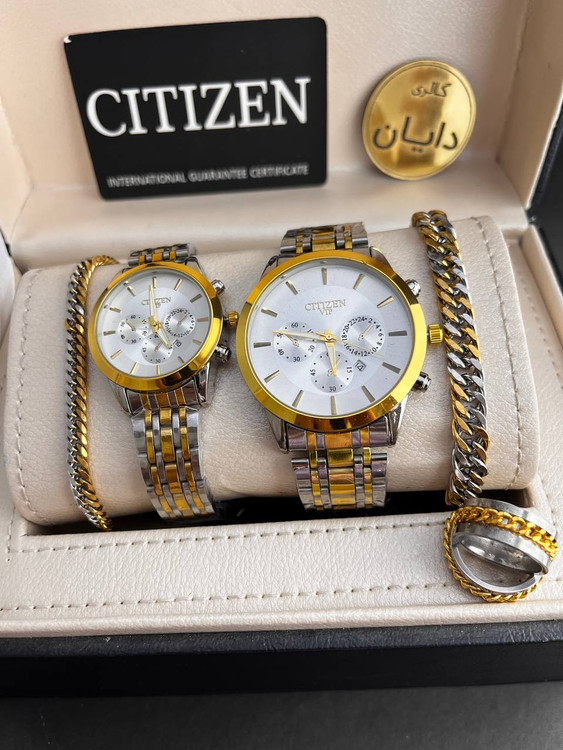 ست ساعت سیتیزن vip تقویم دار صفحه صدفی گارانتی باتری یدکی رنگ ثابت عالی دستبند استیل و حلقه استیل