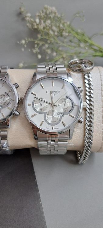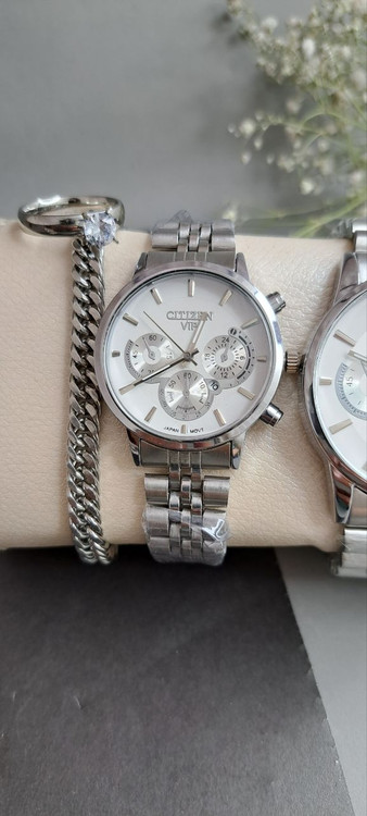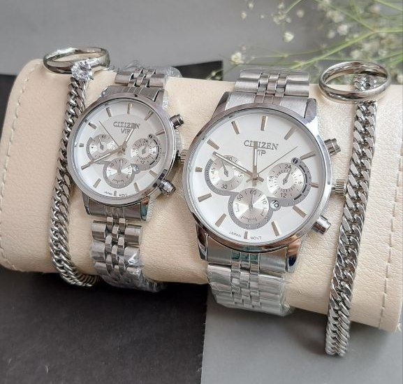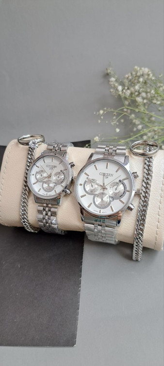 ست ساعت سیتیزن زنانه و مردانه تقویم دار نقره ای رنگ ثابت گارانتی باتری یدکی رنگ ثابت عالی دستبند ست کامل ساعت vip جدید پک کادویی شیک