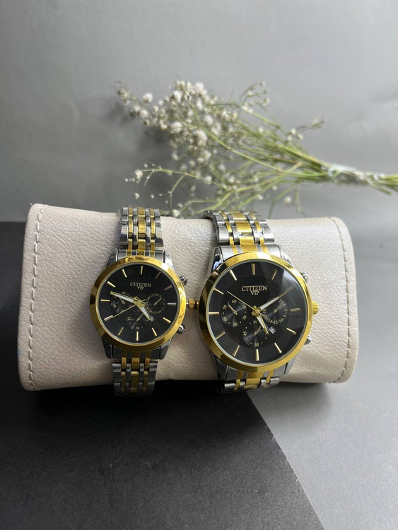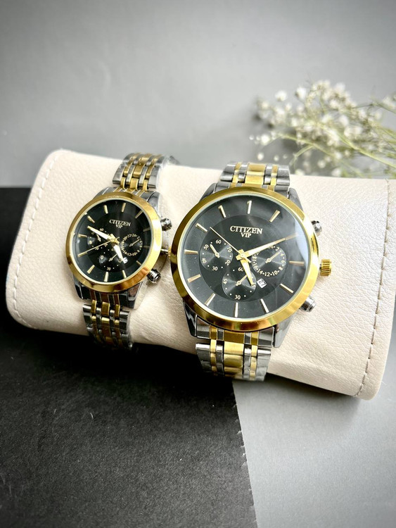 ست ساعت سیتیزن vip تقویم دار صفحه مشکی استیل گارانتی باتری یدکی رنگ ثابت عالی زنانه مردانه
