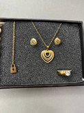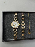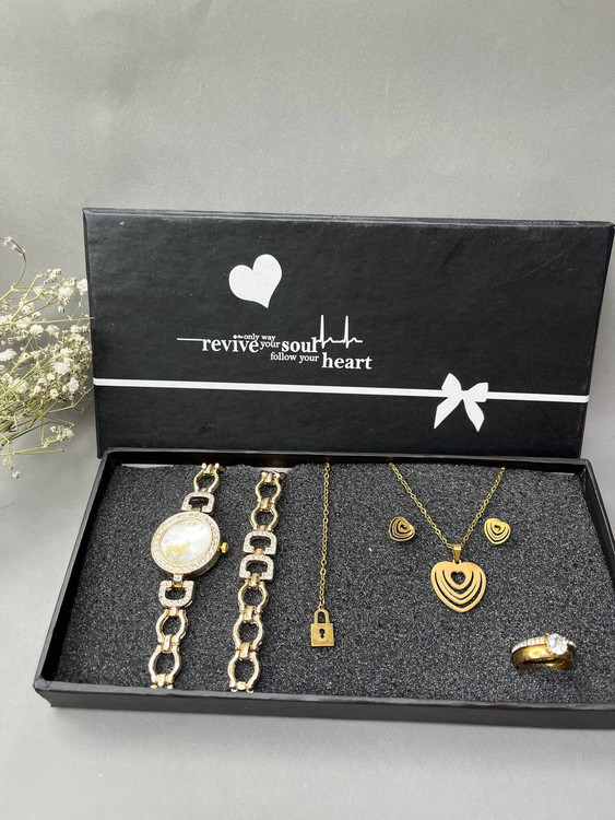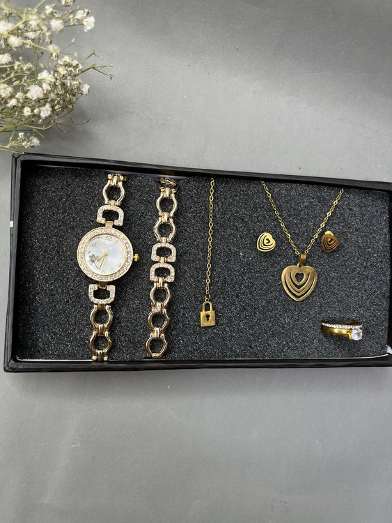 پک کامل باکس ساعت و دستبند زنانه ظریف نگین دار طلایی نیم ست استیل قلبی اویز ساعت رایگان ارسال رایگان