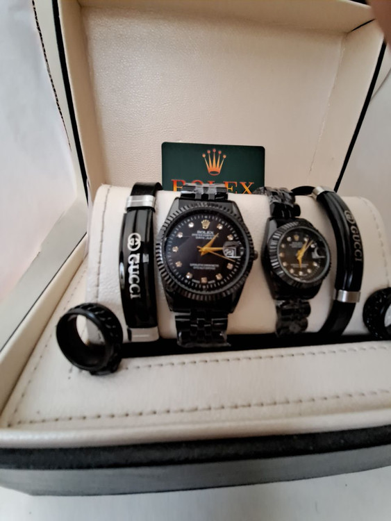 ست ساعت لوکس مچی مشکی برند رولکس rolex شیک دستبند استیل بند چرمی حلقه استیل رنگ ثابت ارسال رایگان قسطی