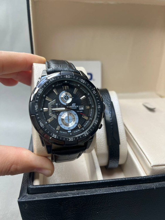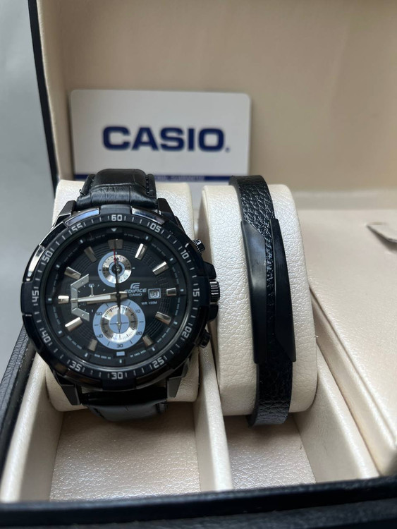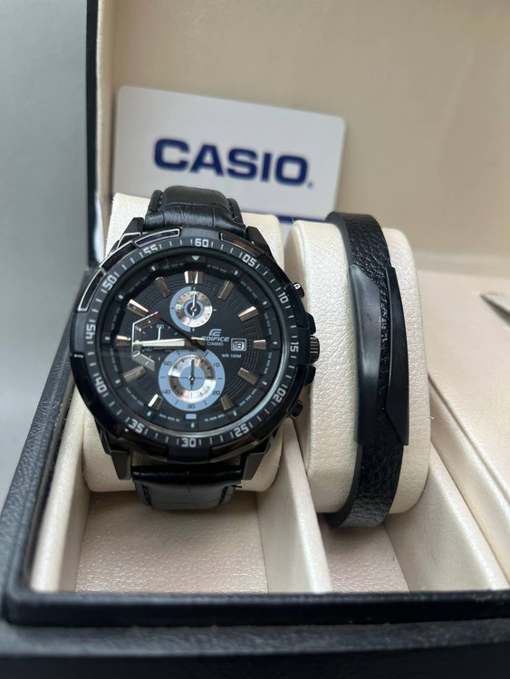ست ساعت مردانه و دستبند مشکی رنگ ثابت بند چرمی سنگین ضد اب گارانتی باتری یدکی ادیفایس روز مرد هدیه اقایان