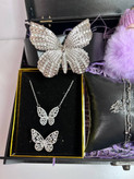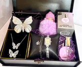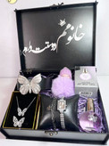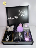 باکس چوبی خوشگل دخترونه رنگ بنفش ست پروانه جواهری ساعت گندمی نگین دار باکس خانومم دوستت دارم