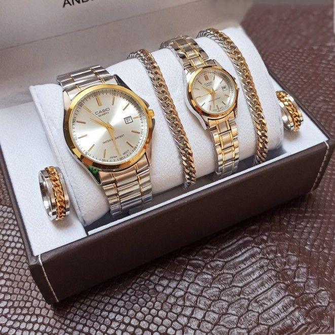 ست ساعت شیک کاسیو زنانه مردانه ست کامل دستبند و حلقه رنگ ثابت ضد اب ارسال رایگان گارانتی
