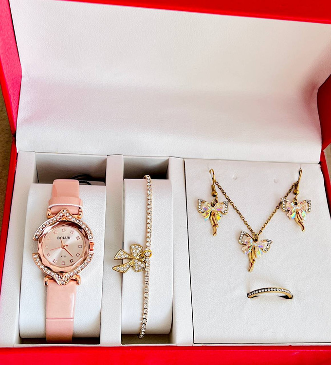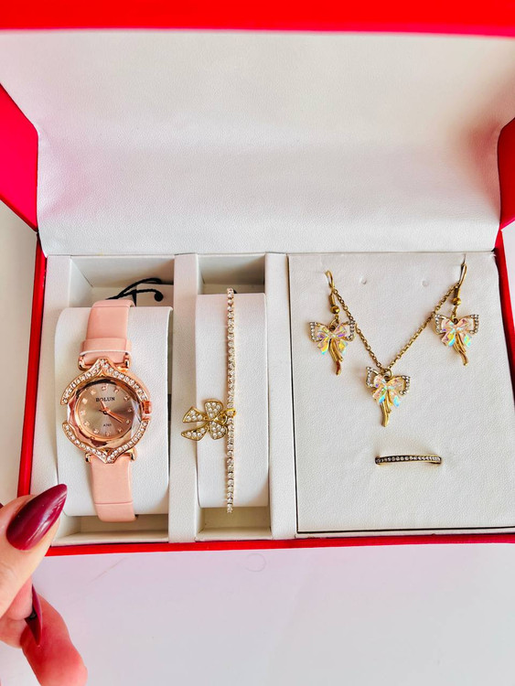 پک ساعت دخترانه صورتی ست پاپیونی ترند دستبند فول نگین هدیه تولد