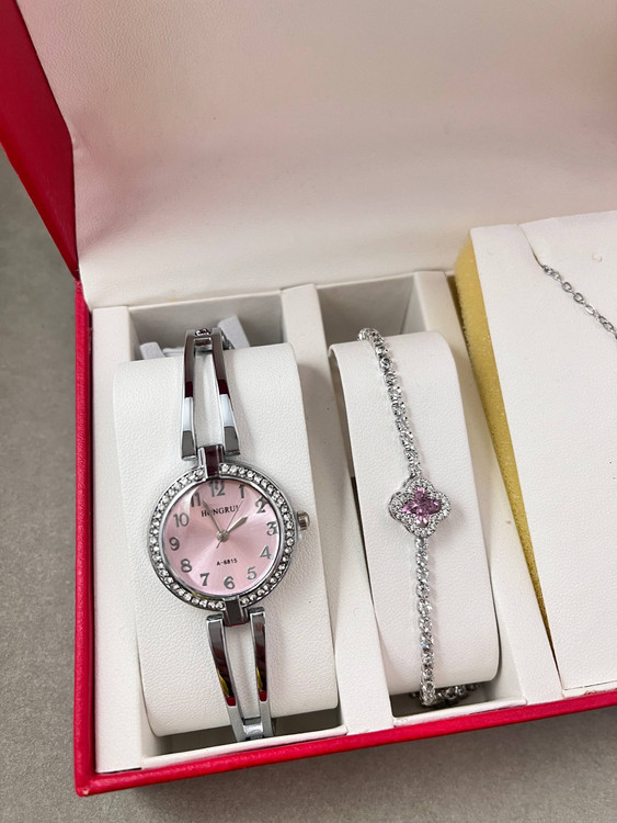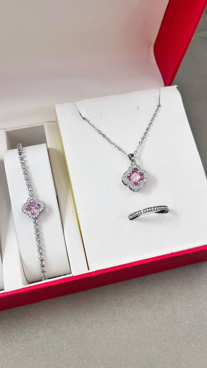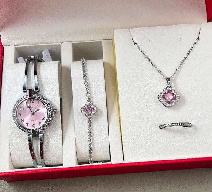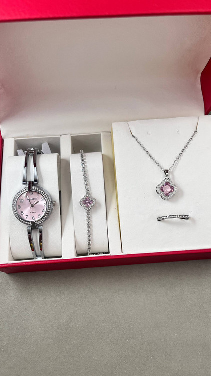 ست شیک ساعت دستبند ونکلیف گردنبند تنیسی ونکلیف و انگشتر زنانه صفحه صورتی رو زن ولنتاین