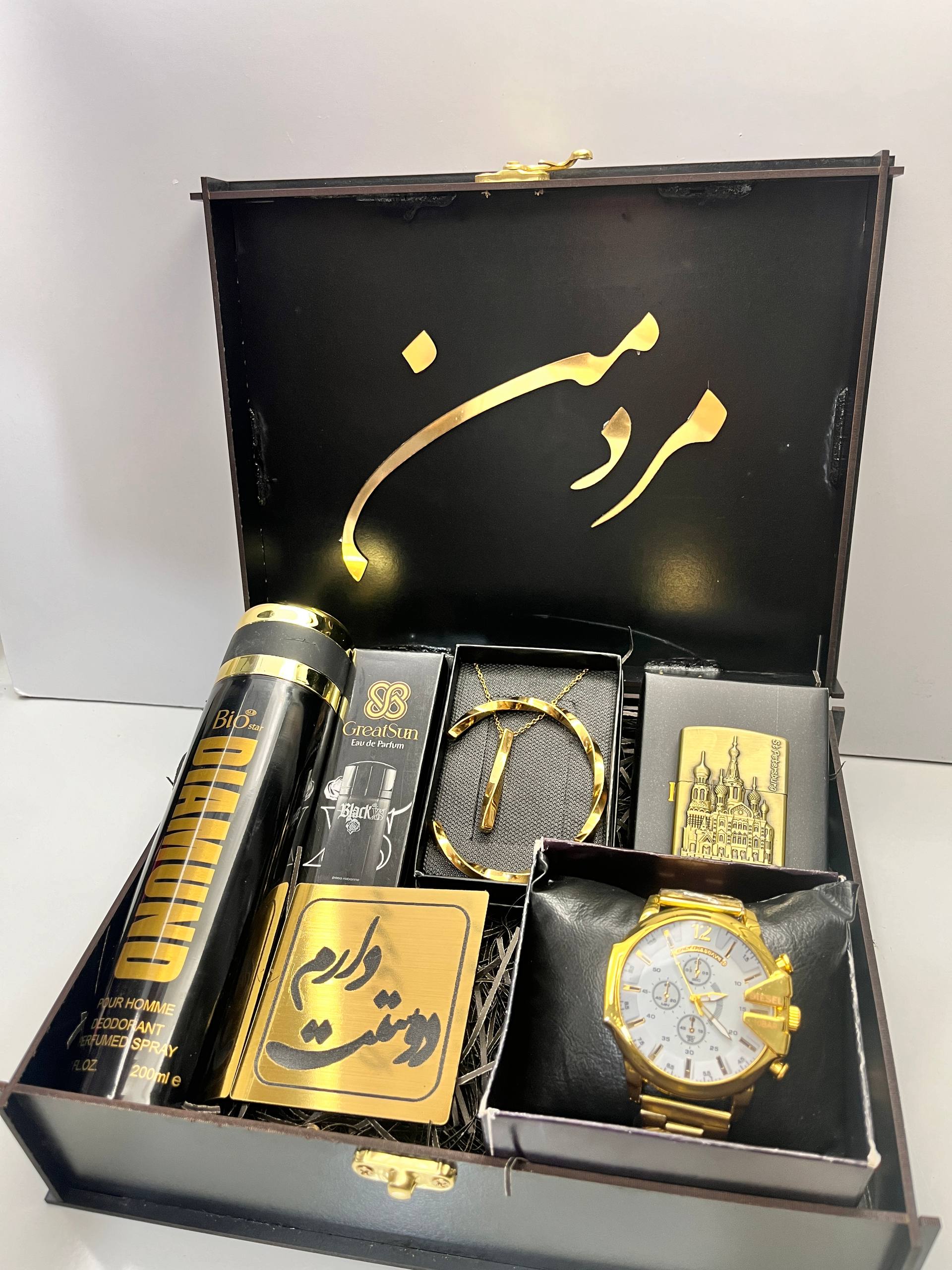 باکس هدیه شیک و لاکچری مردانه خرید کادوی لوکس مشکی طلایی ساعت دیزل شاخدارگردنبند خوشگل