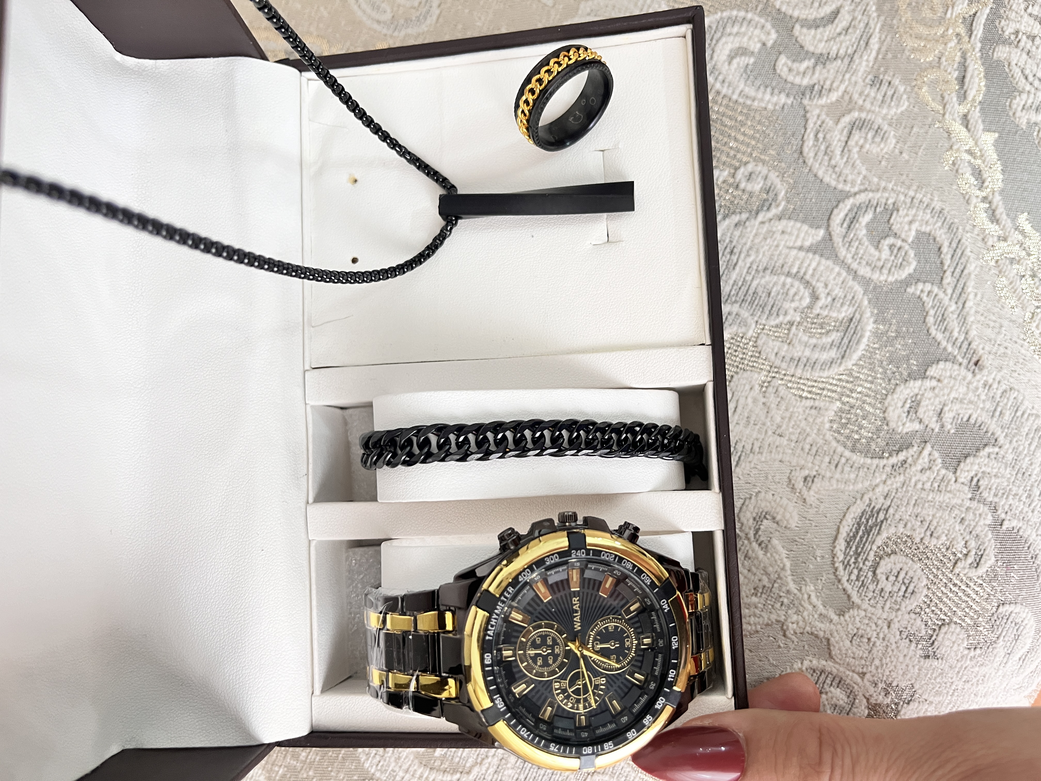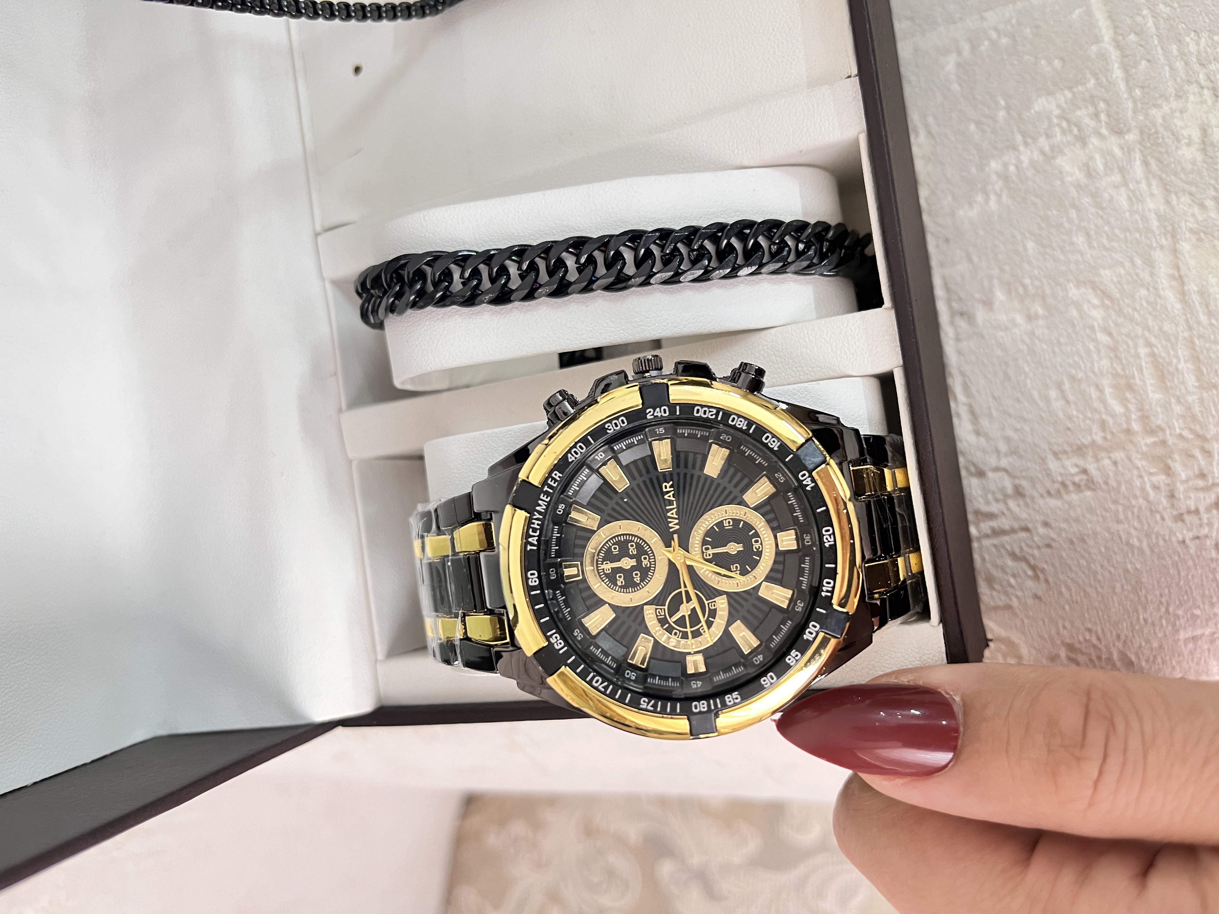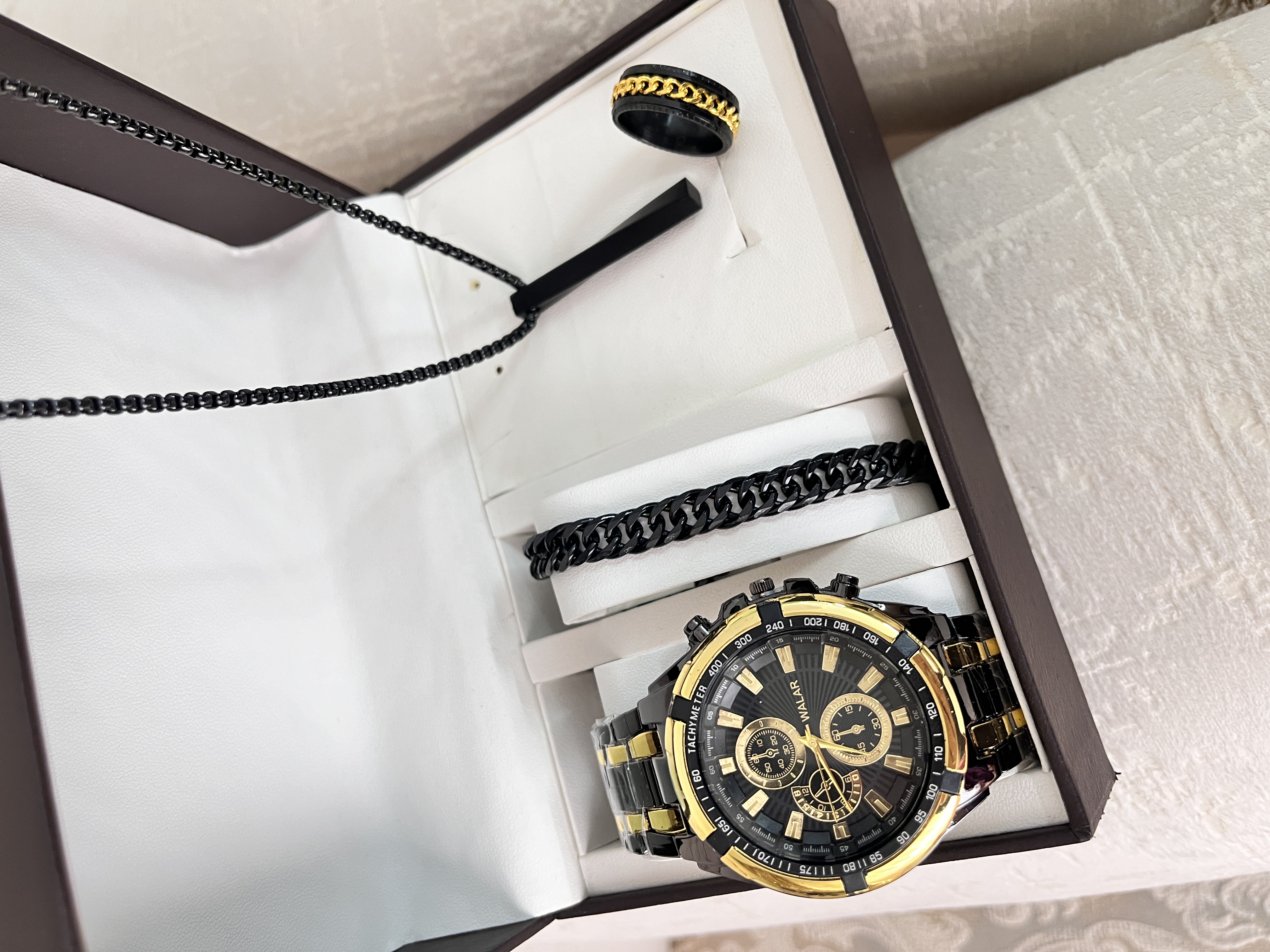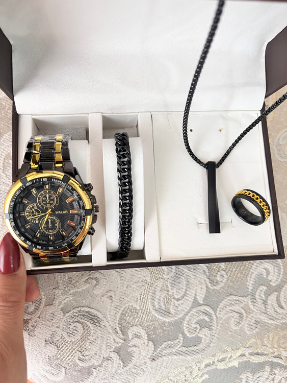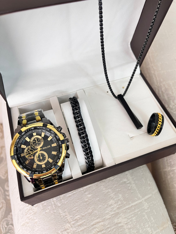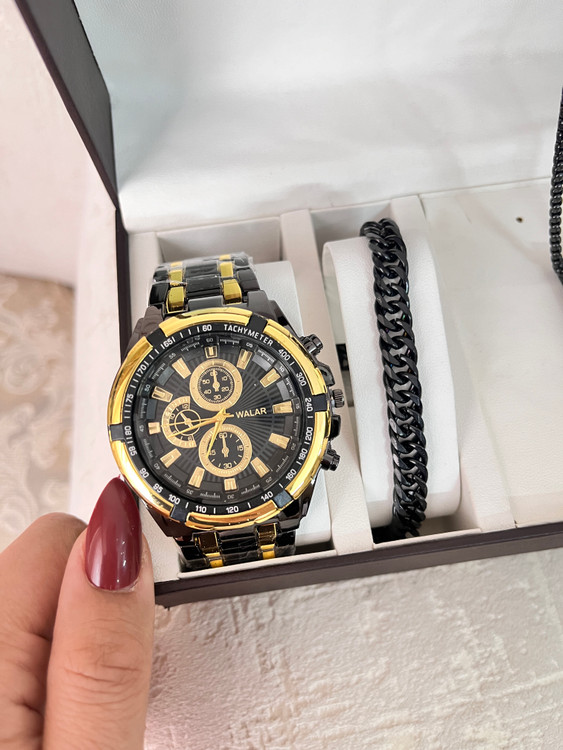 اگر به دنبال یک هدیه خاص و کامل برای آقایان هستید، این پک شیک و جذاب بهترین انتخاب است. این مجموعه شامل یک عدد ساعت مچی برند والار با طراحی مدرن و باکیفیت به همراه اکسسوریهای استیل رنگ ثابت است که استایل شما را تکمیل میکند.