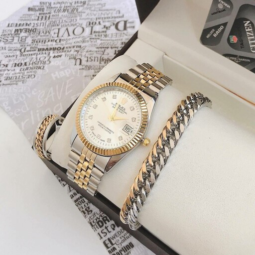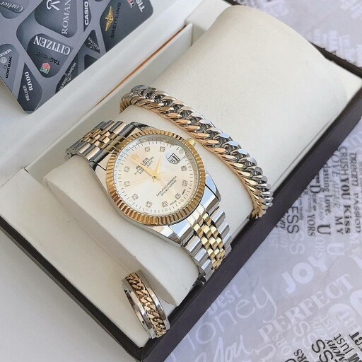 ساعت مردانه رولکس Rolex همراه دستبند و حلقه استیل فول استیل ضد اب همراه باکس روز مرد کادو